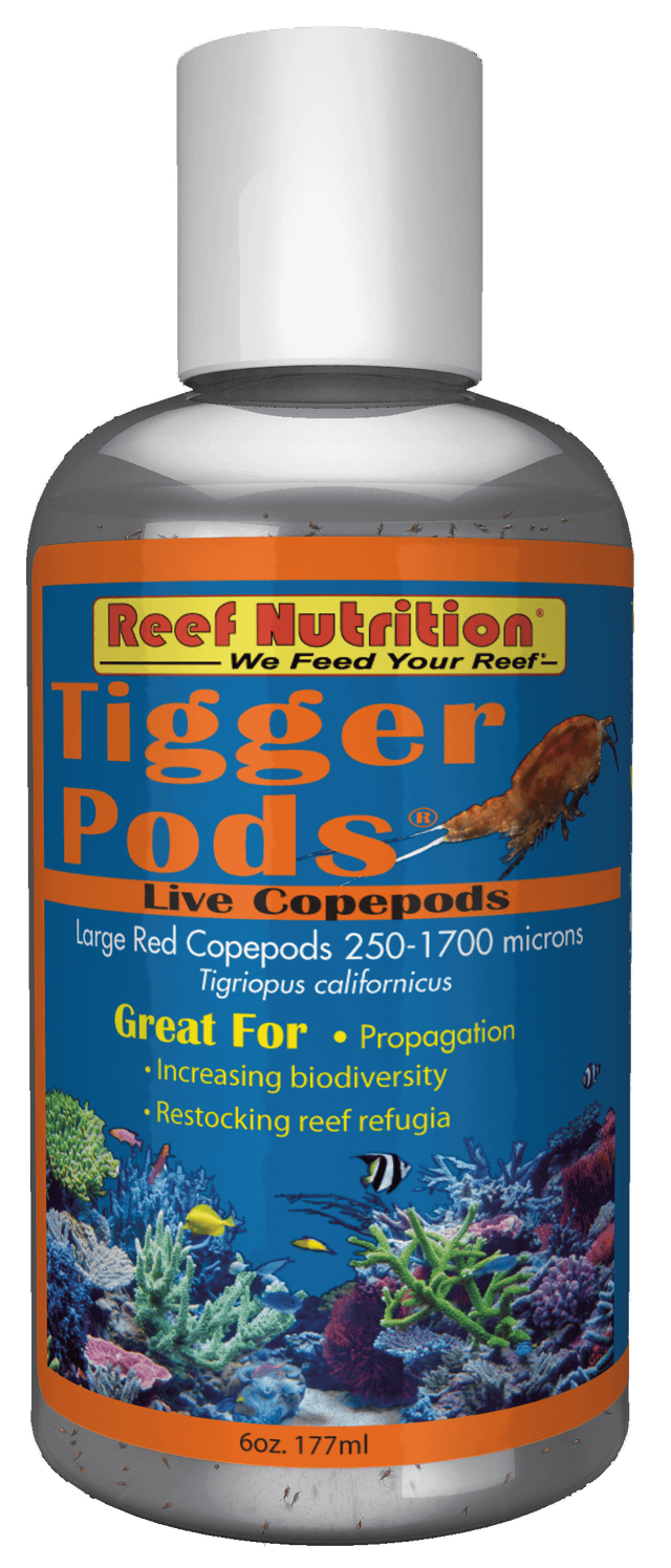 Reef Nutrition's popular Tigger-Pods® (live Tigriopus californicus copepods) are cultured using our own nutritious marine algae in our biosecure facility. Tigger-Pods are attractive large red copepods that swim upwards with a stimulating, jerky swimming motion which is attractive to both fish and people. Finicky fish love them!